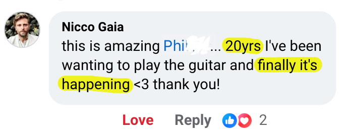 "This is amazing. 20 years I've been wanting to learn the guitar and finally it's happening ♥️ Thank you!"